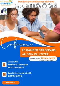 L'association Martinique Jeunesse Solidarité vous invite à sa conférence sur le thème "Le danger des écrans au sein du foyer" animée par Mme PERSIA Laurie (Neuro-Psychologue) Jeudi 20 novembre 2025 de 17h à 19h à l'école EPAR de Mansarde Catalogne.