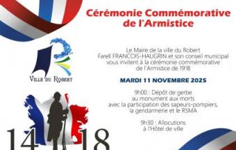 Le Maire de la ville du Robert Farell FRANCOIS-HAUGRIN et son conseil municipal vous invitent à la cérémonie commémorative de l'Armistice de 1918 MARDI 11 NOVEMBRE 2025