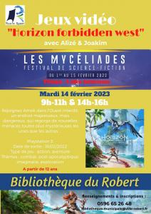 Séance du jeu vidéo " Horizon forbidden west" avec Alizé et Joakim le mardi 14 février 2023 de 9h à 11h et de 14h à 16h à la bibliothèque du Robert.