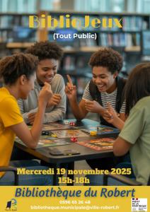 La bibliothèque municipal du Robert vous propose le mercredi 19 novembre 2025 une séance de Bibliojeux de 15h à 18h à la bibliothèque (tout public)