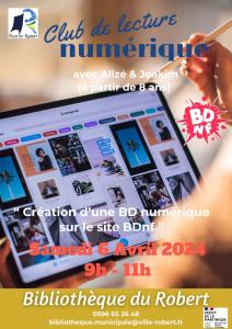 Création d'une BD numérique sur le site BDnf avec Alizé et Joakim le samedi 6 Avril 2024 à la bibliothèque de 9h à 11h.