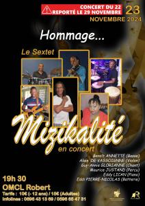 La présidente de l'Office Municipal de la Culture et des Loisirs du Robert vous propose le concert du sextet "MIZIKALITE" à 19h30 à l'OMCLR Bd Henri Auzé.