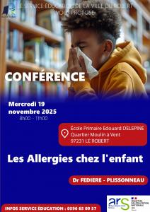 Le service éducation de la ville du Robert vous propose un atelier d'échange sur le thème "Les allergies chez l'enfant" animé par le Docteur FEDIERE-PLISSONEAU mercredi 19 novembre 2025 de 8h à 11h à l'école élémentaire Edouard De Lépine à Moulin à Vent.