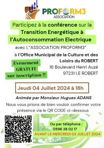L'association Proform3 vous invite à sa conférence sur la "Transition Energétique à l’Autoconsommation Electrique" jeudi 4 juillet 2024 à 18h à l’Office Municipal de la Culture et des