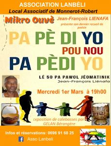 - Jean-François LIENAFA pour la présentation de son dernier recueil de poésie "Pa Pè Di Yo Pou Nou Pa Pèdi Yo"