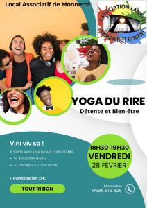L'association Lanbéli vous propose LE YOGA DU RIRE [détente et bien-être] le vendredi 28 février 2025 de 18h30 à 19h30 au local associatif de Monnérot.